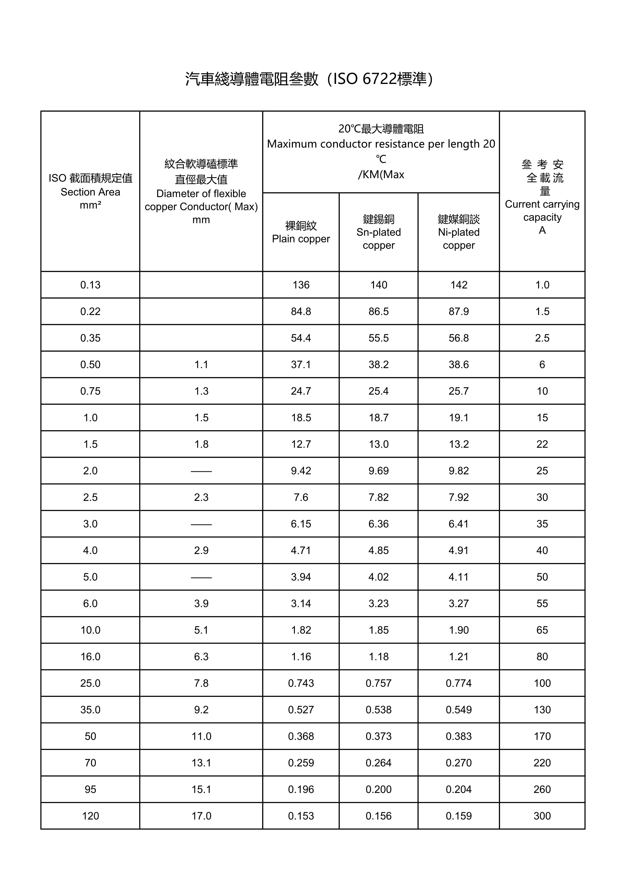 汽車線導(dǎo)體電阻參數(shù)